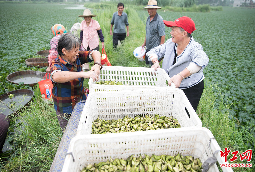 2020年7月22日,江苏南通,海安市白甸镇金百莲农场的村民正在采摘菱角。翟慧勇/视觉中国