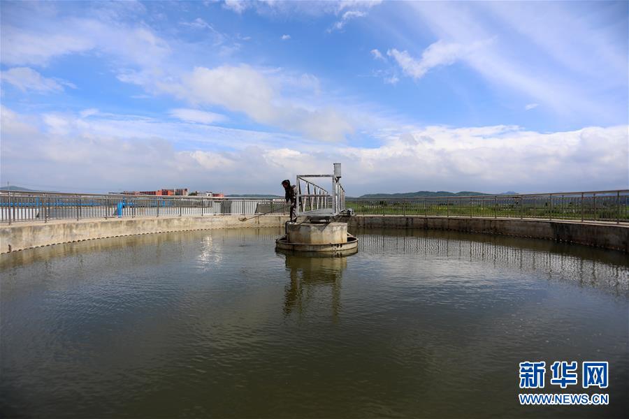 7月21日,工作人员在贵州草海污水处理厂污水净化池打捞残渣。新华社发(何欢 摄)