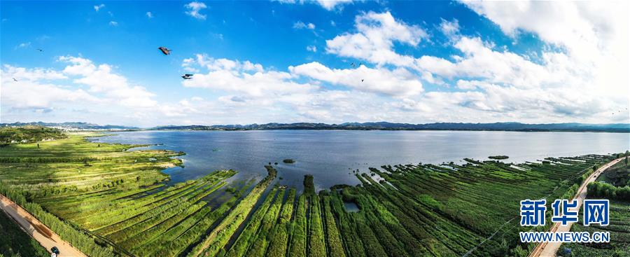 鸟儿在草海上空飞翔(无人机全景照片,6月9日摄)。新华社记者 杨文斌 摄