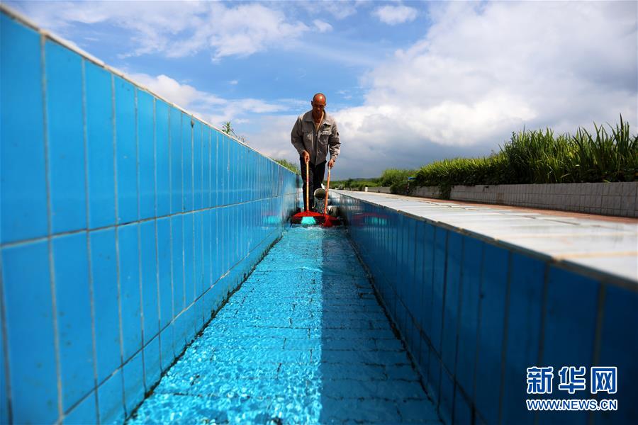 7月21日,工作人员在贵州草海污水处理厂人工湿地清扫排水沟。新华社发(何欢 摄)
