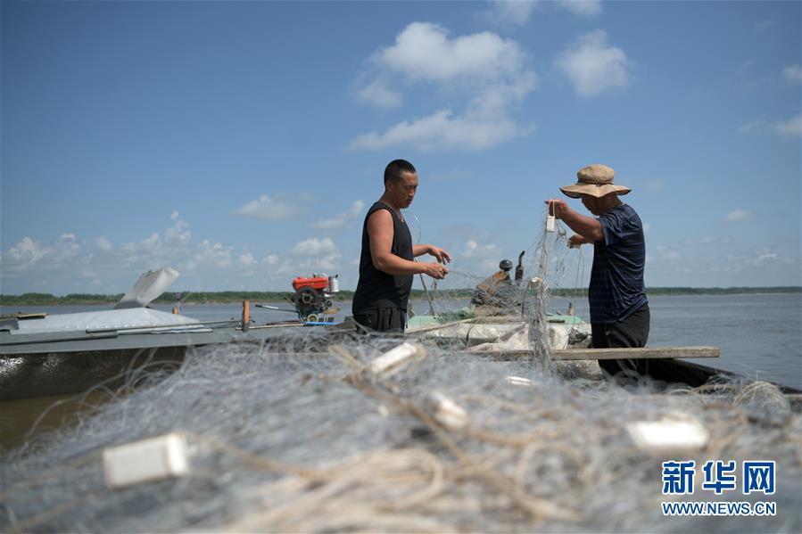 7月22日,在二道江滩地,八岔村的赫哲族村民在整理渔网。新华社记者王建威摄