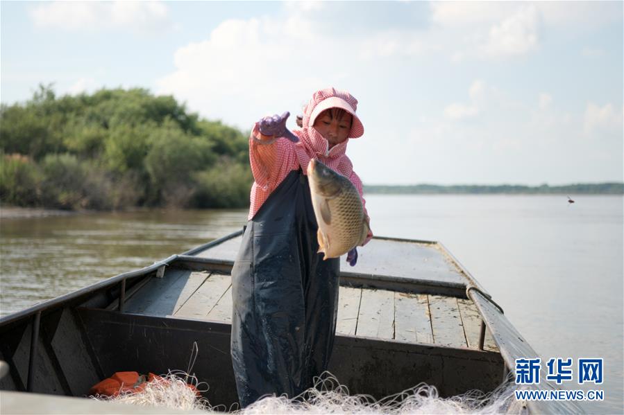 7月22日,在二道江滩地,赫哲族村民刘洪海的妻子丛秀松把刚打上来的鱼放进船舱。新华社记者王建威摄