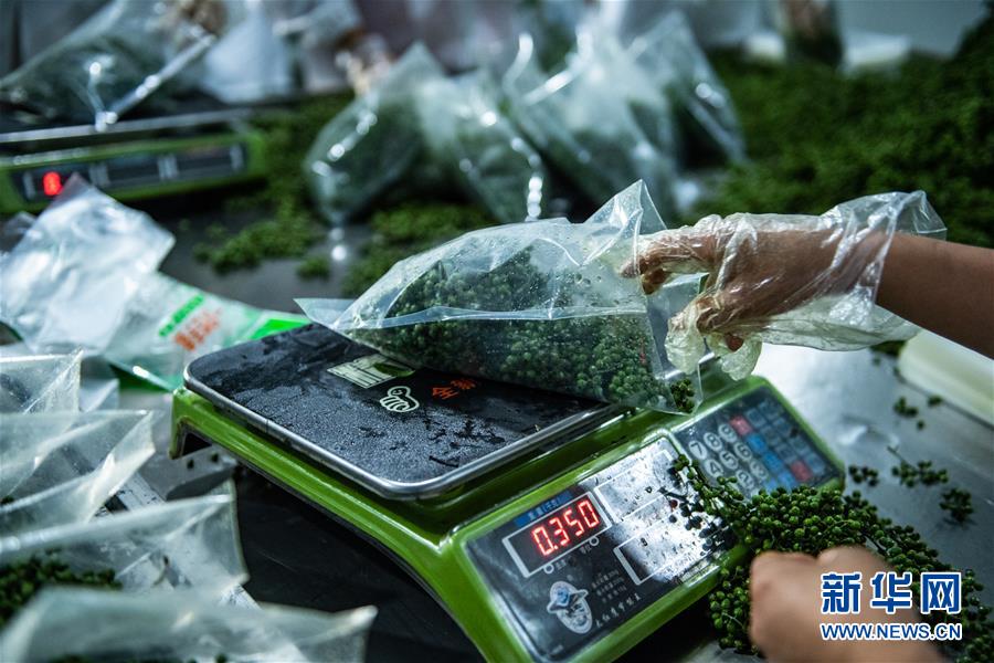 在桐梓县容光镇的一家加工厂,工人在对装袋花椒称重(7月22日摄)。 近年来,贵州省遵义市桐梓县因地制宜,鼓励群众种植花椒,发展花椒产业。通过“龙头企业+合作社+农户”模式,促进花椒产业集约化、标准化发展。目前,全县花椒种植面积达17.52万亩,共有29000多户农户参与,其中有4724户是贫困户,花椒产业已成为当地群众脱贫增收的重要产业之一。 新华社记者 陶亮 摄