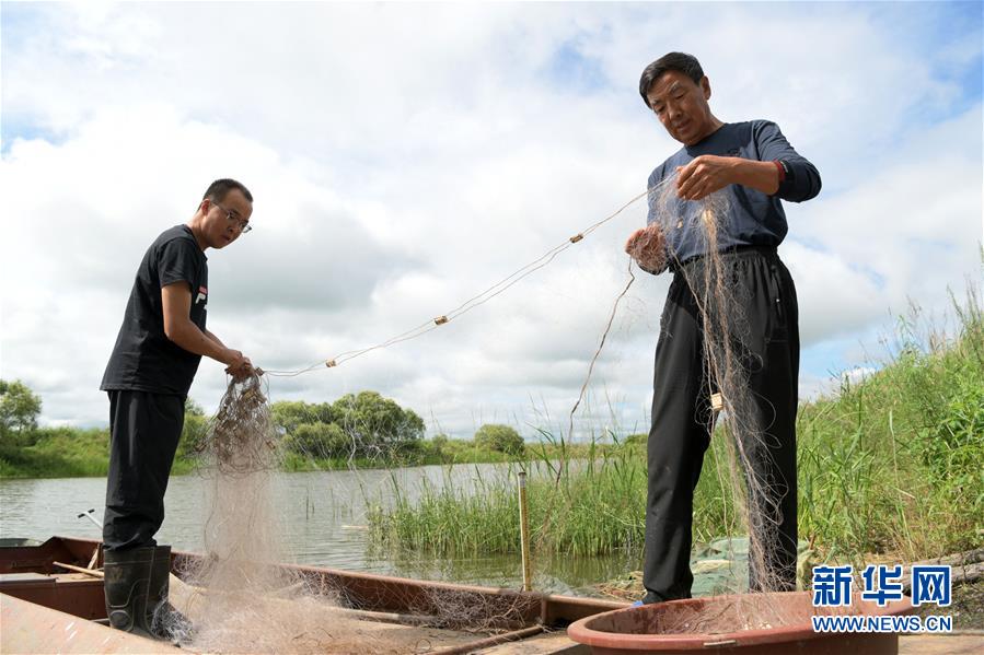 八岔村的赫哲族养鱼大户李延鹏(左)和父亲李俊在整理鱼网(7月21日摄)。 新华社记者 王建威 摄
