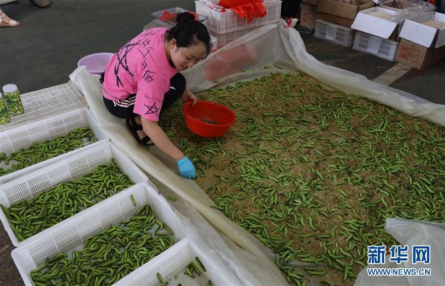 在江苏省灌云县向阳路农贸市场,一名商户在挑选豆丹(7月20日摄)。 豆丹,俗称豆青虫,以大豆等农作物叶子为食,一度被视为害虫。而在江苏省灌云县,豆丹却是一道家喻户晓的美食,市场售价每公斤超百元,养殖豆丹成为农民增收的特色产品。目前,灌云全县豆丹养殖面积约20000亩,是全国最大的豆丹交易集散地,形成了集豆丹养殖、销售、加工于一体的完整产业链,带动了数万人就业。为打造豆丹品牌,灌云县已连续举办九届“豆丹美食文化节”,灌云的餐馆因擅长烹饪豆丹,吸引全国各地的食客慕名而来。 新华社发(刘浏 摄)