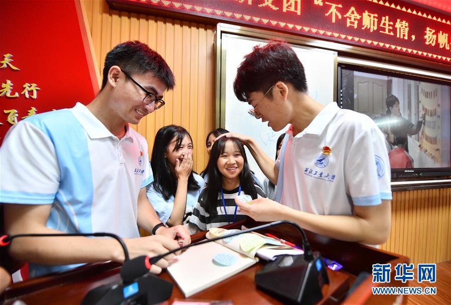 在融水苗族自治县思源实验学校举办的支教团送别晚会上,支教老师谭博天(右一)和徐晨曦(左一)收到同学们的寄语卡片(7月22日摄)。