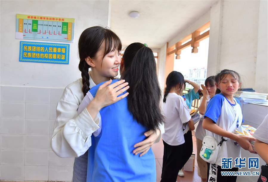 在融水苗族自治县民族中学1818班举办的送别班会上,同学们和支教老师高洁(左一)拥抱告别(7月23日摄)。新华社记者 黄孝邦 摄
