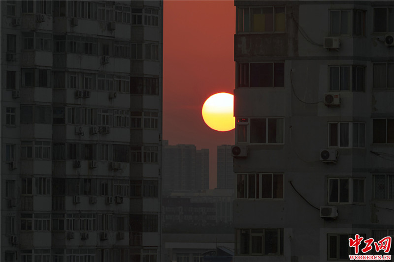 2020年7月24日,北京,暑夏清晨,红日初升楼宇间,空中彩云飞天,一道美丽风景。黄重金/视觉中国