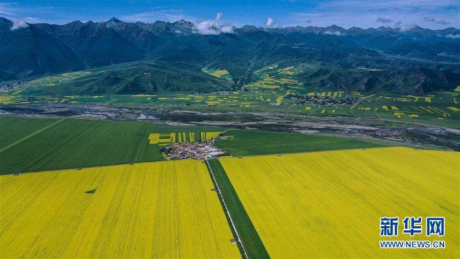 这是7月22日拍摄的门源回族自治县的油菜花田(无人机照片)。 时下正值高原油菜花竞相绽放的季节,在青海省海北藏族自治州门源回族自治县,金黄色的油菜花在高原蓝天和云雾映衬下形成一幅壮丽画卷,吸引游客前来观赏。 新华社记者 吴刚 摄