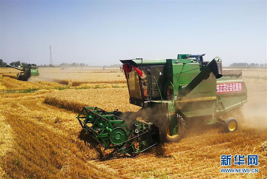 7月21日,收割机在内蒙古巴彦淖尔市临河区干召庙镇棋盘村小麦种植基地收割小麦(手机拍摄)。新华社记者 李云平 摄