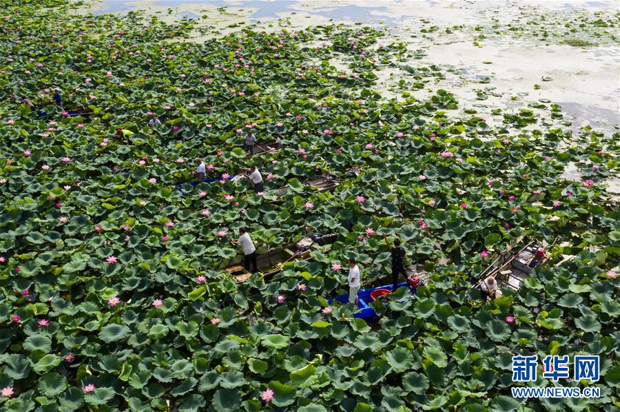 7月24日,江苏省泗洪县临淮镇溧河村水生植物种植专业合作社的社员在采收莲蓬(无人机照片)。新华社发(许昌亮 摄)