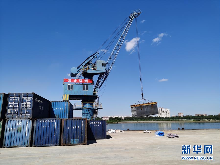 在黑龙江黑河口岸,吊车在吊装集装箱(7月22日摄)。 新华社记者 管建涛 摄