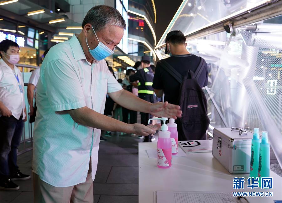 7月25日,在上海大宁音乐广场,观看露天电影展映的观众在入场前清洁手部。新华社记者 刘颖 摄