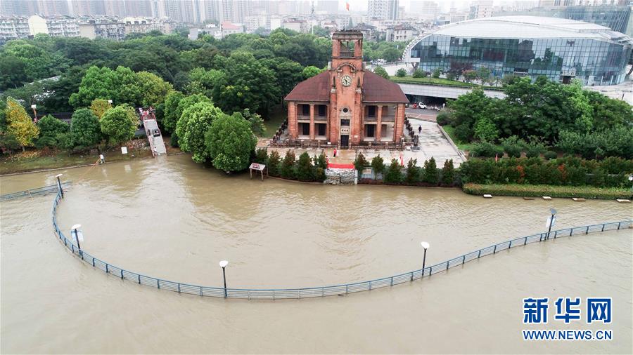 芜湖市标志性建筑之一老海关前的观景平台已被江水淹没(7月25日摄,无人机照片)。新华社记者 曹力 摄