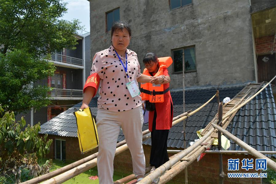 在江西省鄱阳县昌洲乡马湖村,徐小花(左)帮助村民陈留娇回家拿取物品后离开被淹的房子(7月24日摄)。新华社记者 彭昭之 摄