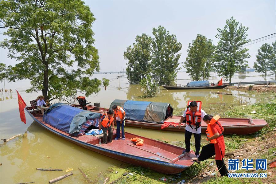 在江西省鄱阳县昌洲乡马湖村,村民们登船准备进村回家拿取物品(7月24日摄)。新华社记者 彭昭之 摄