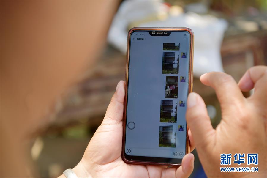 在江西省鄱阳县昌洲乡马湖村,徐小花通过手机把村里退水情况和村民家中情况传给安置点的村民(7月25日摄)。新华社记者 彭昭之 摄