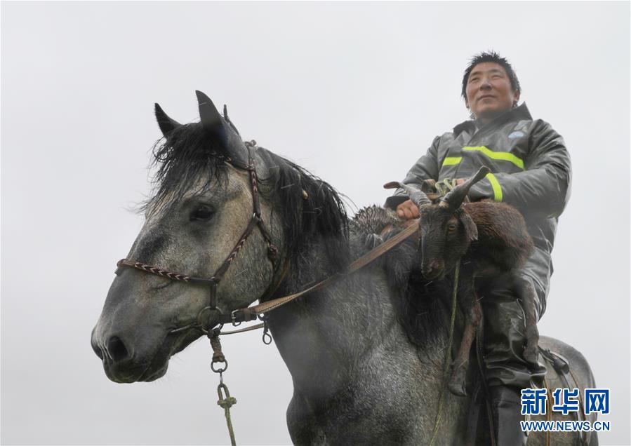 7月25日,牧民将走失的小羊带往千羊崖。新华社发(杜哲宇 摄)