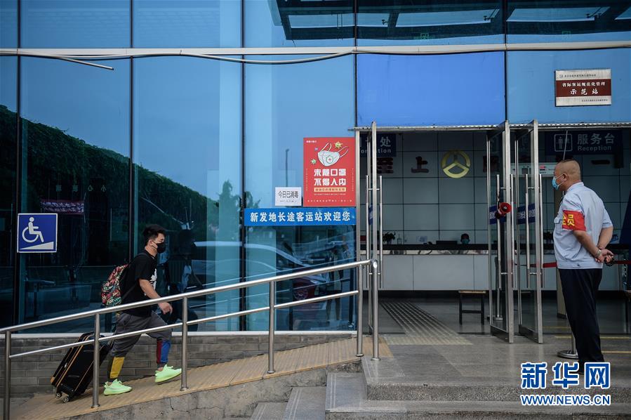 7月26日,一名乘客(左)来到北京新发地长途客运站。 在做好各项疫情防控措施的前提下,北京新发地长途客运站于7月26日起恢复营运。 新华社记者 彭子洋 摄