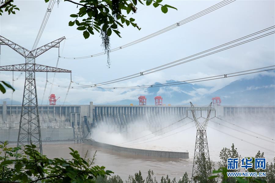 7月26日在湖北省宜昌市秭归县拍摄的三峡枢纽泄洪深孔的泄洪景象。 水利部长江水利委员会水文局26日14时发布消息说,“长江2020年第3号洪水”在长江上游形成,预计27日晚三峡水库最大入库流量在60000立方米/秒左右。 新华社发(王罡 摄)