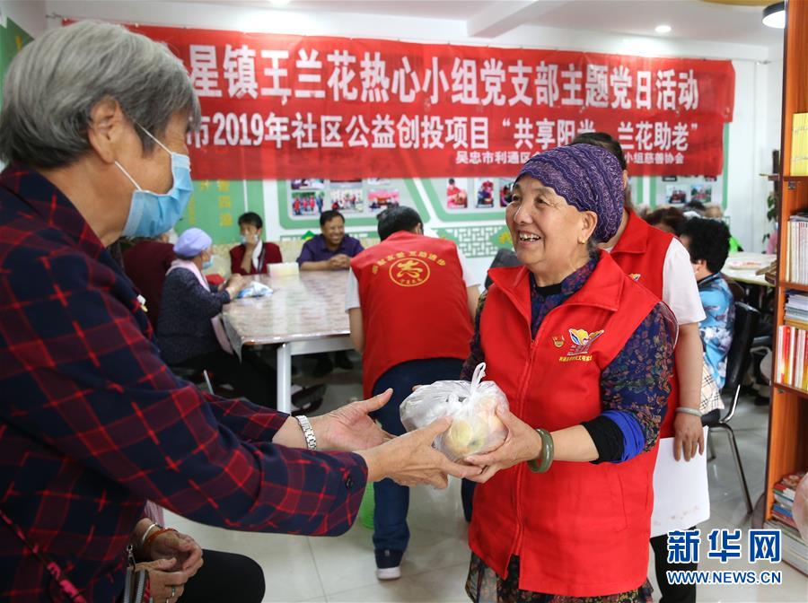 王兰花(右)向来到兰花志愿服务站参加活动的老人发放“爱心水果”(6月23日摄)。新华社记者 贾浩成 摄