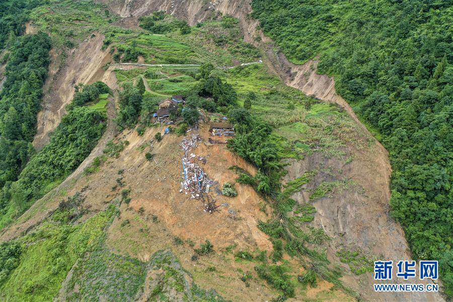 这是7月26日拍摄的重庆市武隆区土地乡六井村中台组中堡滑坡现场(无人机照片)。 记者26日从重庆市武隆区政府了解到,暴雨导致当地发生山体滑坡并形成堰塞湖,500余名群众紧急转移。 新华社记者 黄伟 摄