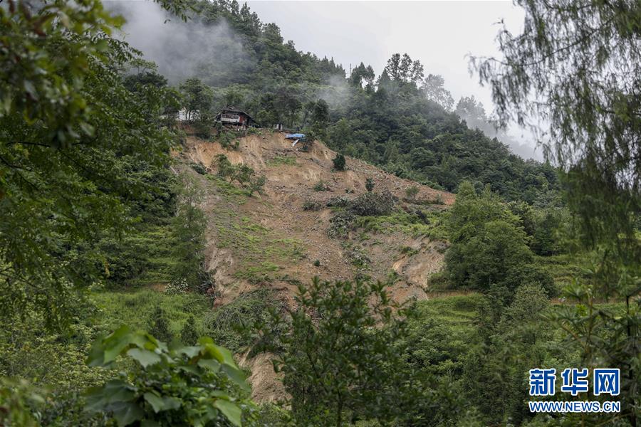 这是7月26日拍摄的重庆市武隆区土地乡六井村中台组中堡滑坡现场(无人机照片)。 记者26日从重庆市武隆区政府了解到,暴雨导致当地发生山体滑坡并形成堰塞湖,500余名群众紧急转移。 新华社记者 黄伟 摄