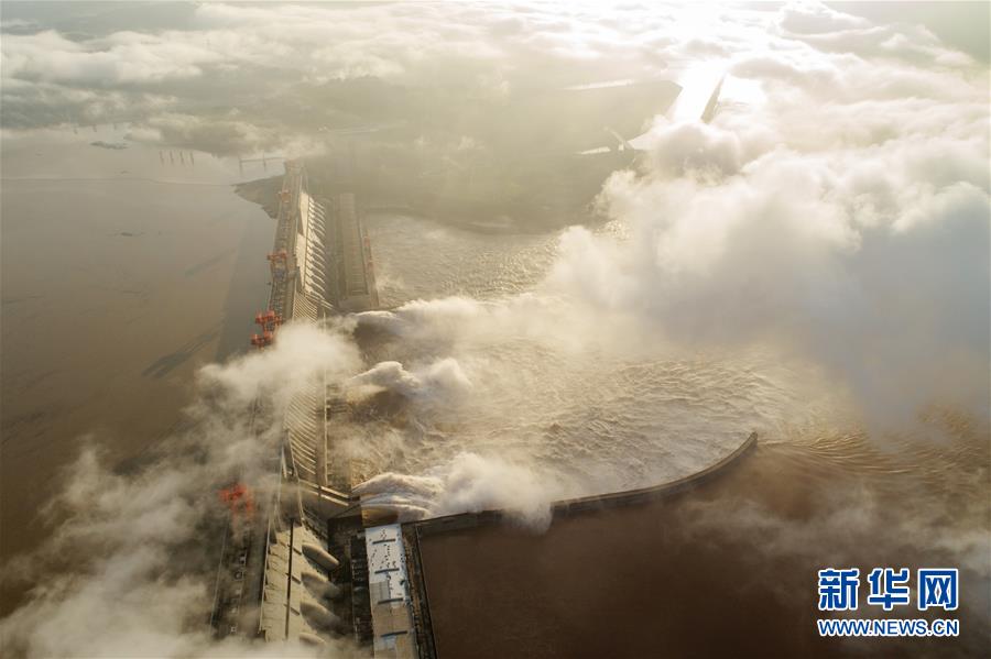 7月27日,长江三峡枢纽工程开启泄洪深孔泄洪(无人机照片)。新华社发(王罡 摄)