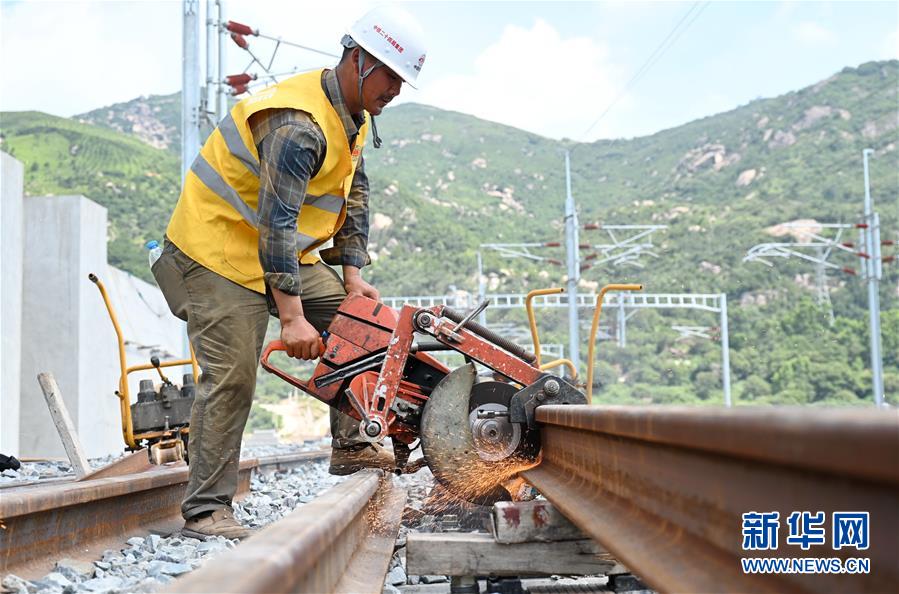 7月28日,施工人员在福州长乐松下站长轨换铺现场作业。 当日,在福建福州长乐松下站建设工地,中铁二十四局施工人员将最后一根长轨换铺到位,标志着国家重点项目福平铁路全线铺轨贯通。 福平铁路是京福高铁的重要延伸段,线路全长约88公里,为时速200公里的Ⅰ级双线铁路。 新华社记者 林善传 摄