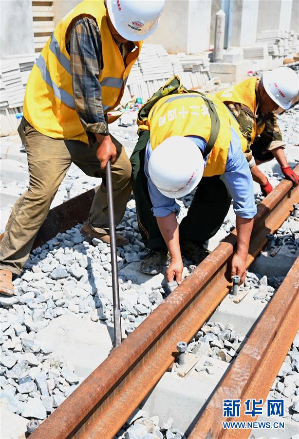 7月28日,施工人员在福州长乐松下站长轨换铺现场进行扣件安装作业。 当日,在福建福州长乐松下站建设工地,中铁二十四局施工人员将最后一根长轨换铺到位,标志着国家重点项目福平铁路全线铺轨贯通。 福平铁路是京福高铁的重要延伸段,线路全长约88公里,为时速200公里的Ⅰ级双线铁路。 新华社记者 林善传 摄