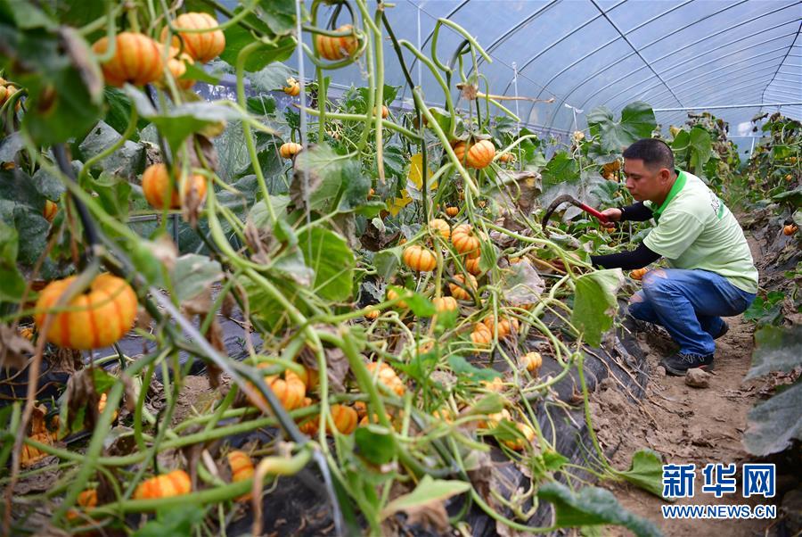 7月24日,在陕西汉阴县涧池镇紫云南郡易地扶贫搬迁安置社区配套的农业产业园内,社区居民唐文斌在管护大棚南瓜。 陕南地区地处秦巴山区,是陕西脱贫攻坚的主战场。近年来,陕南各县区因地制宜、精准施策,通过发展社区工厂、特色种植、旅游扶贫、技能培训、电商带货等措施,促进多种产业发展,助力农民增收。 新华社记者 邵瑞 摄
