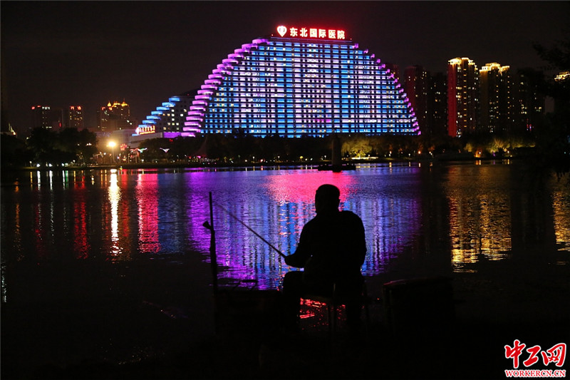 2020年7月28日,沈阳盛夏夜,河道与旁边的亮灯的建筑物相互映衬,市民在桥下休闲,在河边钓鱼。朱华强/视觉中国