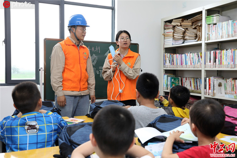 2020年7月28日,在江苏省扬州市宝应县山阳镇春光村“希望村塾”里,电力志愿者们正在为留守儿童讲解农村夏季安全用电知识。当日,扬州市宝应县供电公司联合宝应县公安局组织青年志愿者来到山阳镇春光村“希望村塾”开展向留守儿童宣传假期安全知识活动,现场讲解、示范安全用电操作方法和溺水急救常识等,并为留守儿童发放安全宣传手册和学习用品,让孩子们安全快乐过暑假。沈冬兵、郑宝元/IC photo