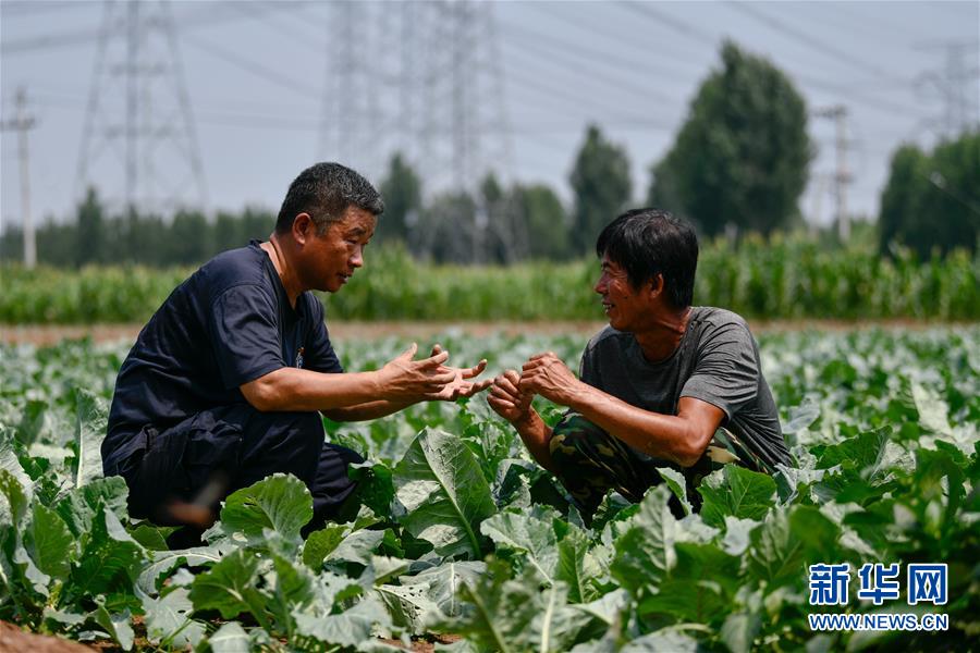 7月30日,在天津市武清区豆张庄镇,方海波(左)与村民在田地里交谈。 新华社发 (孙凡越 摄)