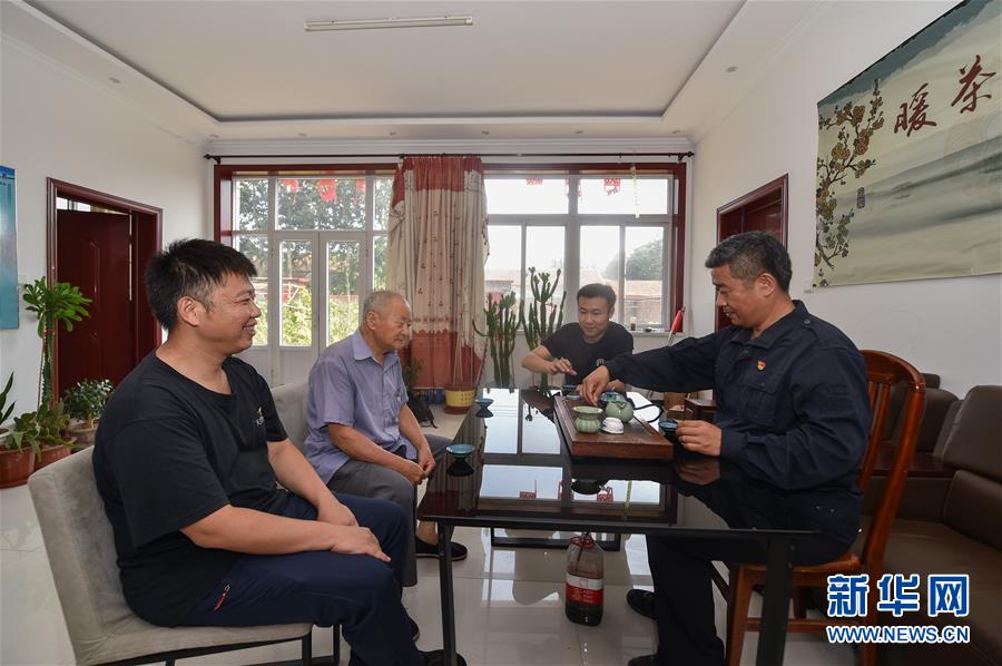 7月30日,方海波(前右)和工作组成员与村民在帮扶工作组驻地喝茶谈心。新华社发 (孙凡越 摄)