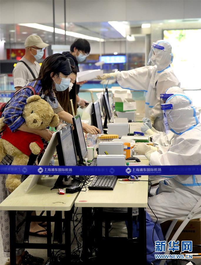 7月31日,上海浦东国际机场海关人员身着防护服对入境航班的旅客进行登记检查。 连日来,上海最高气温超过34摄氏度。在高温和疫情防控双重考验下,上海浦东国际机场海关、边检等一线工作者坚守岗位,保障旅客出行安全。 新华社记者 陈飞 摄