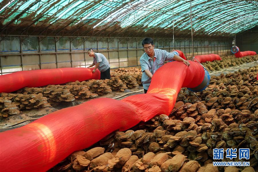 7月31日,韩子夜(前)与韩子南在灵芝种植棚内利用吸粉机收集孢子粉。新华社记者 牟宇 摄