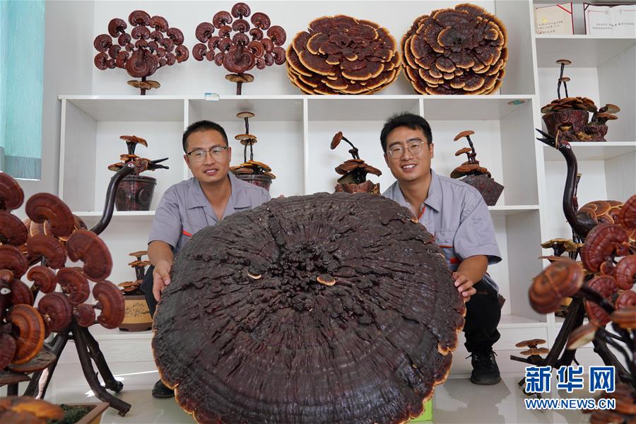 7月31日,韩子南(左)和韩子夜展示他们培育出的直径达1米的巨型灵芝。新华社记者 牟宇 摄
