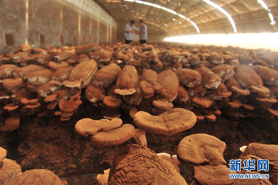 7月31日,韩子南(右)与韩子夜在灵芝种植棚内查看灵芝长势。新华社记者 牟宇 摄