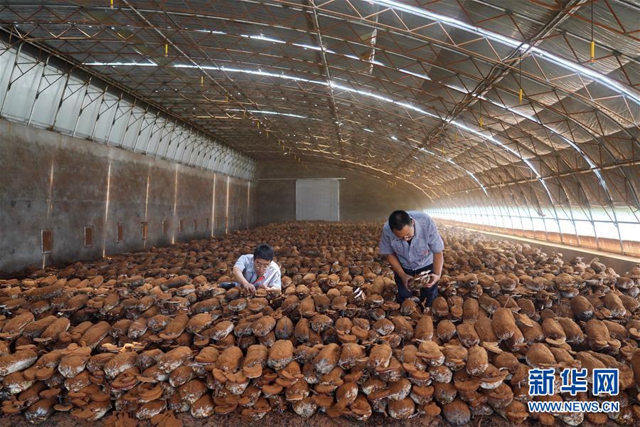 7月31日,韩子南(右)与韩子夜在灵芝种植棚内查看灵芝长势。新华社记者 牟宇 摄