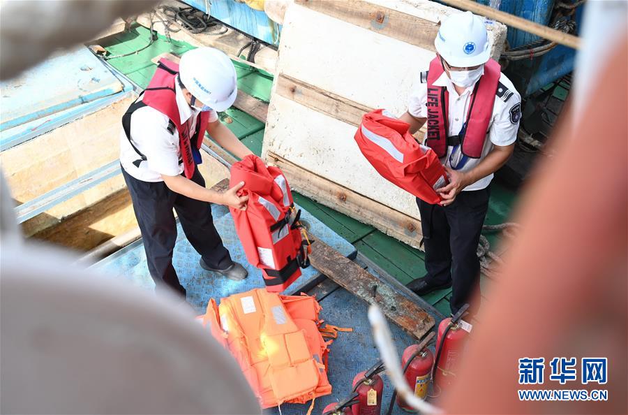 7月31日,福建省海洋与渔业执法总队执法人员在“闽东渔61553”船上检查消防救生设备。 当日,福建、广东两省组织执法船艇在闽粤交界海域开展编队执法巡航,共同维护闽粤交界海域的正常渔业生产秩序。 新华社记者 林善传 摄