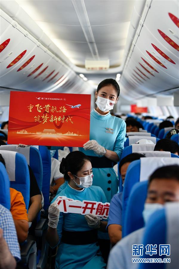 7月31日,从天津飞往武汉的主题航班乘务员向乘客展示“八一开航”七十周年纪念展板。新华社发(孙凡越 摄)