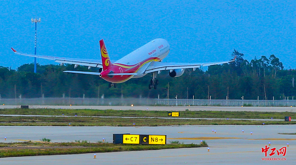2020年7月30日,在海口美兰国际机场二期扩建项目的跑道上,A330宽体客机滑行成功起飞。这也意味着该项目已具备民用客机的起降保障能力,正式由基础建设阶段全面转向准备投运通航阶段,海南自贸港空中新门户蓄势待发。