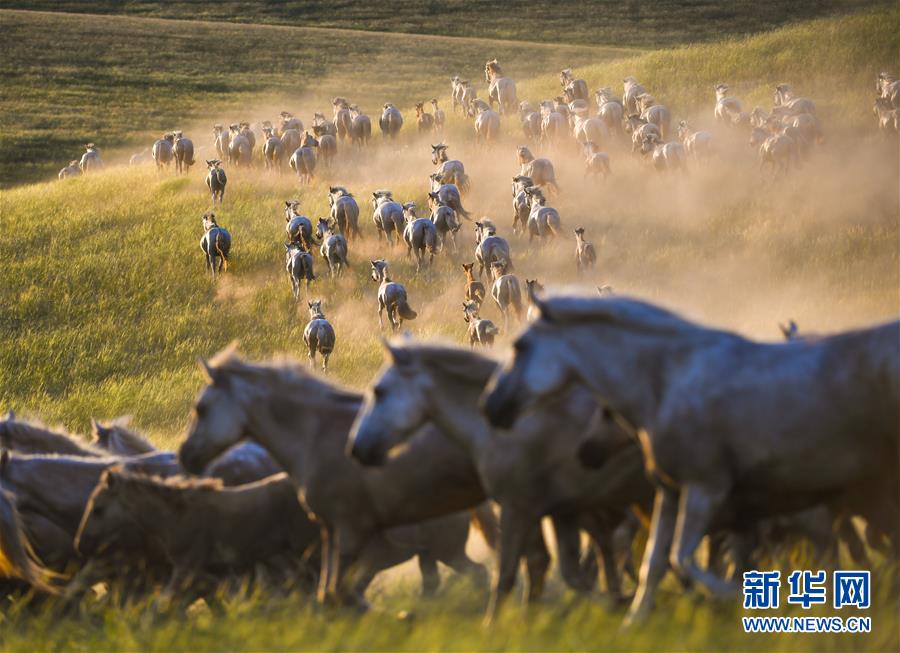 7月31日,草原上奔跑的马群。 当日,内蒙古西乌珠穆沁旗在巴彦胡舒苏木白马繁育基地的草原上进行套马活动,向广大游客展示套马技艺和草原民俗文化。 新华社记者彭源摄