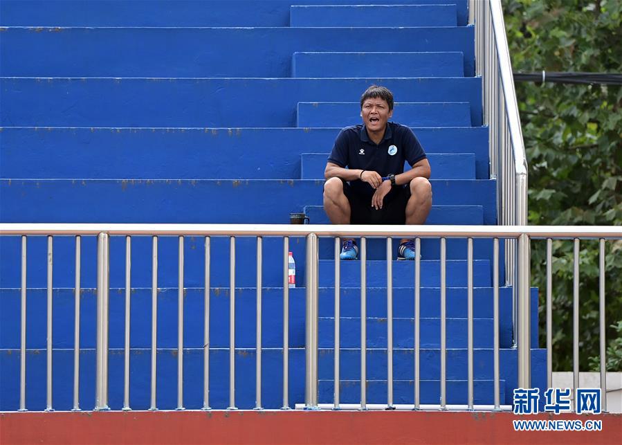 这是河南省实验中学高中足球队主教练窦志刚在看台观看对抗练习(7月21日摄)。 新华社记者李嘉南摄