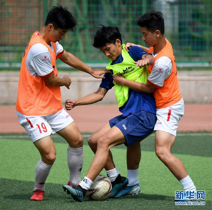 这是河南省实验中学高中足球队队员张雅各(中)在对抗练习中拼抢(7月21日摄)。 新华社记者李安摄