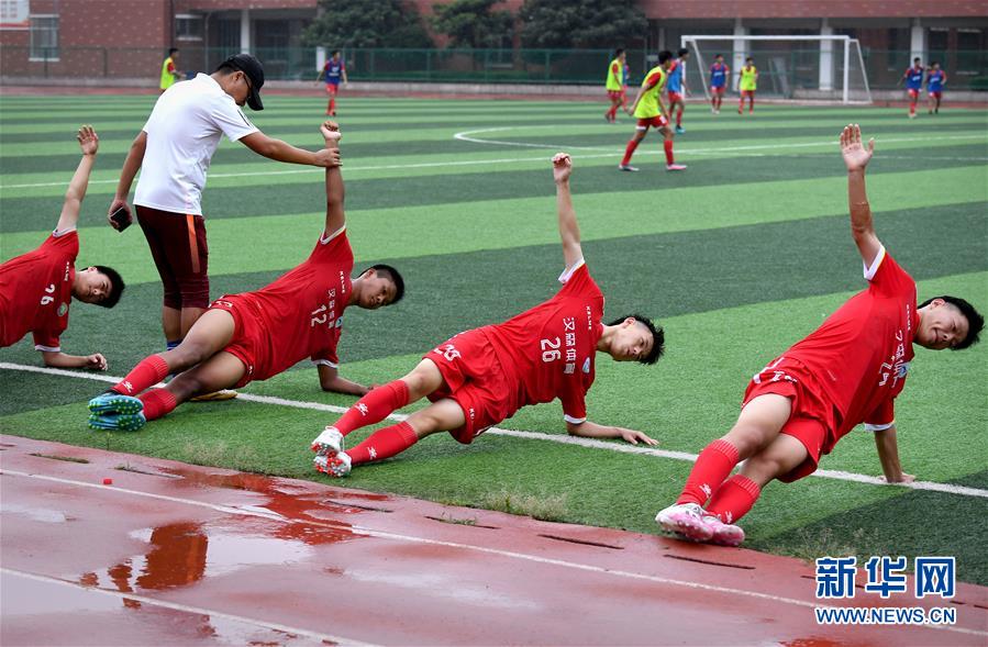 这是河南省实验中学高中足球队队员在进行训练(7月22日摄)。 新华社记者李安摄