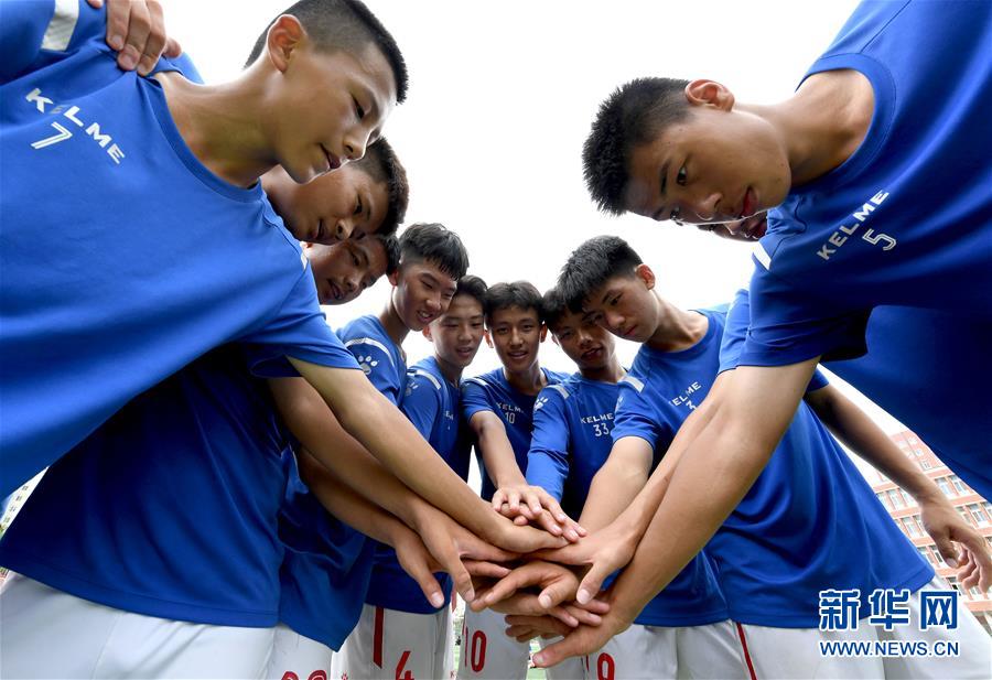这是河南省实验中学高中足球队队员在进行对抗练习前互相鼓劲(7月28日摄)。 新华社记者李安摄