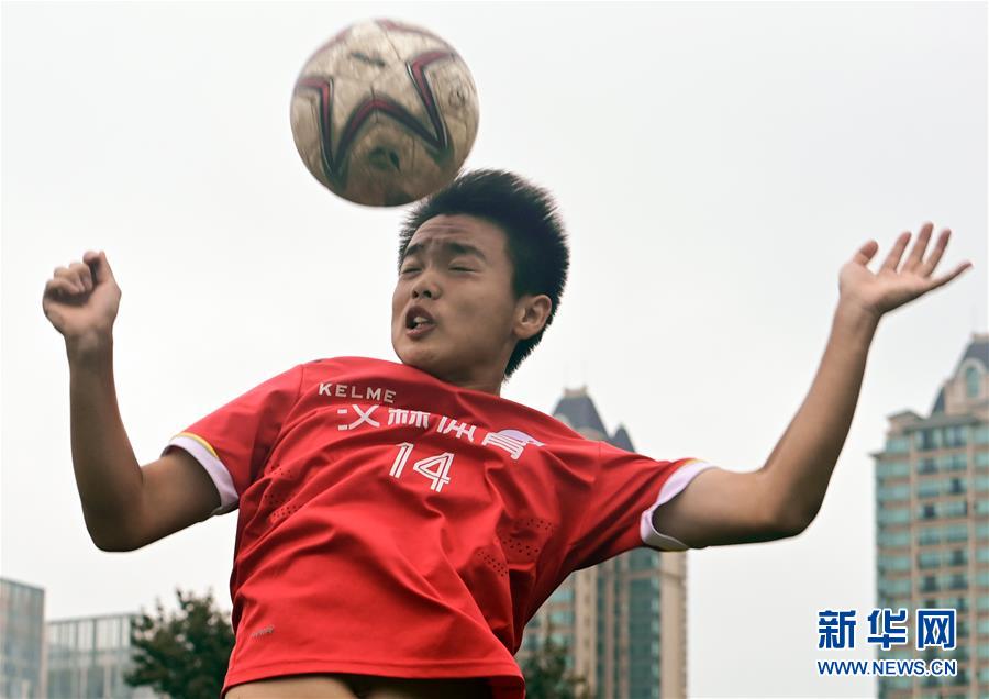 这是河南省实验中学高中足球队队员马铭辰在进行头球练习(7月22日摄)。 新华社记者李嘉南摄