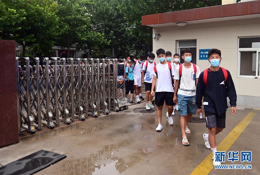 这是河南省实验中学高中足球队队员排队进入学校(7月26日摄)。 新华社记者李嘉南摄